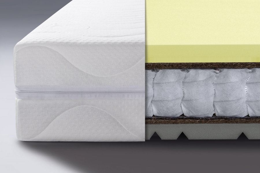 - PUR pena 28kg/m3, 2 x kokosová vrstva 1300 gr/m2, taštičková pružina 250 ks/m2 – 7 zon,